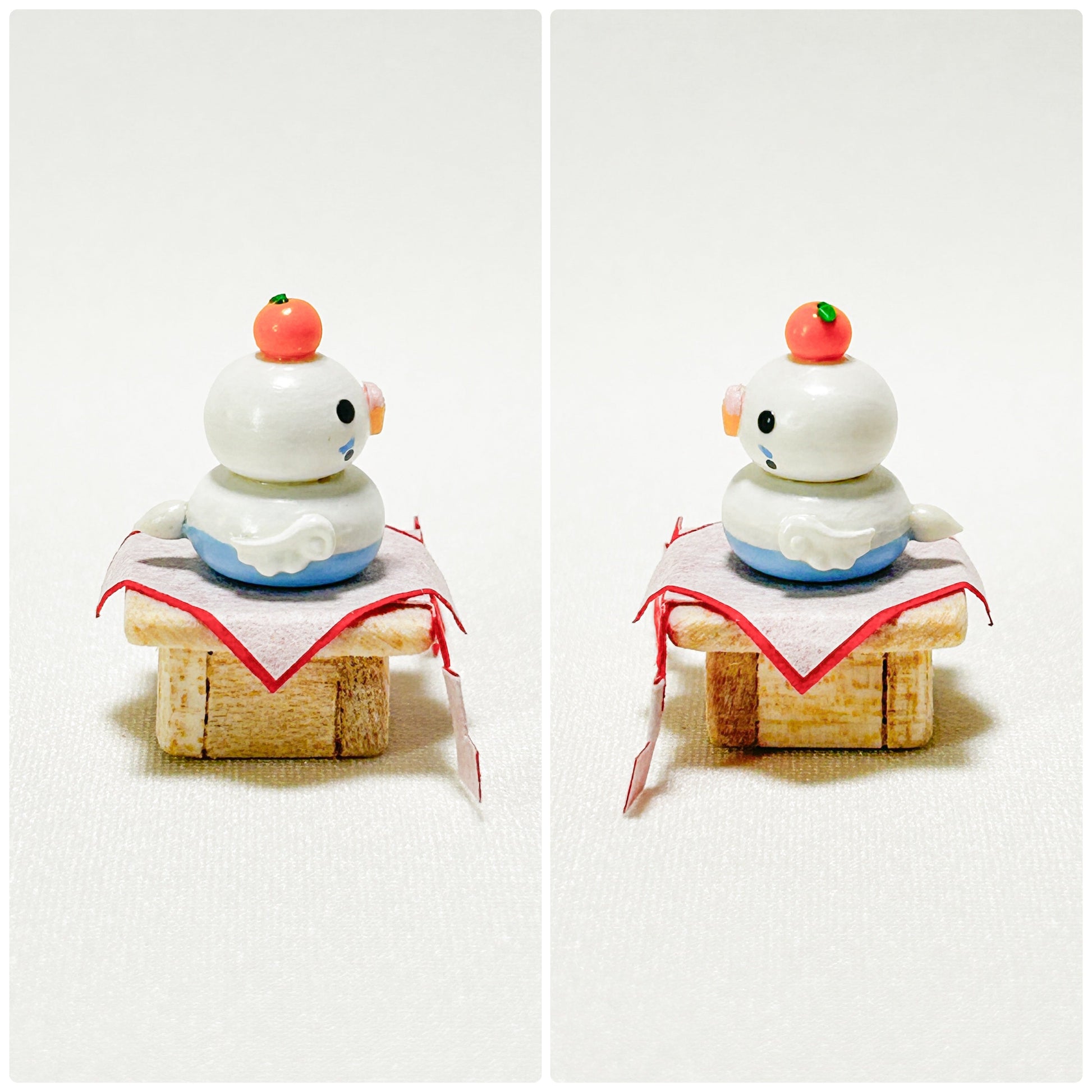 - The kagami mochi birdie and the wooden base are not glued together. Please feel free to place and arrange them as you like.